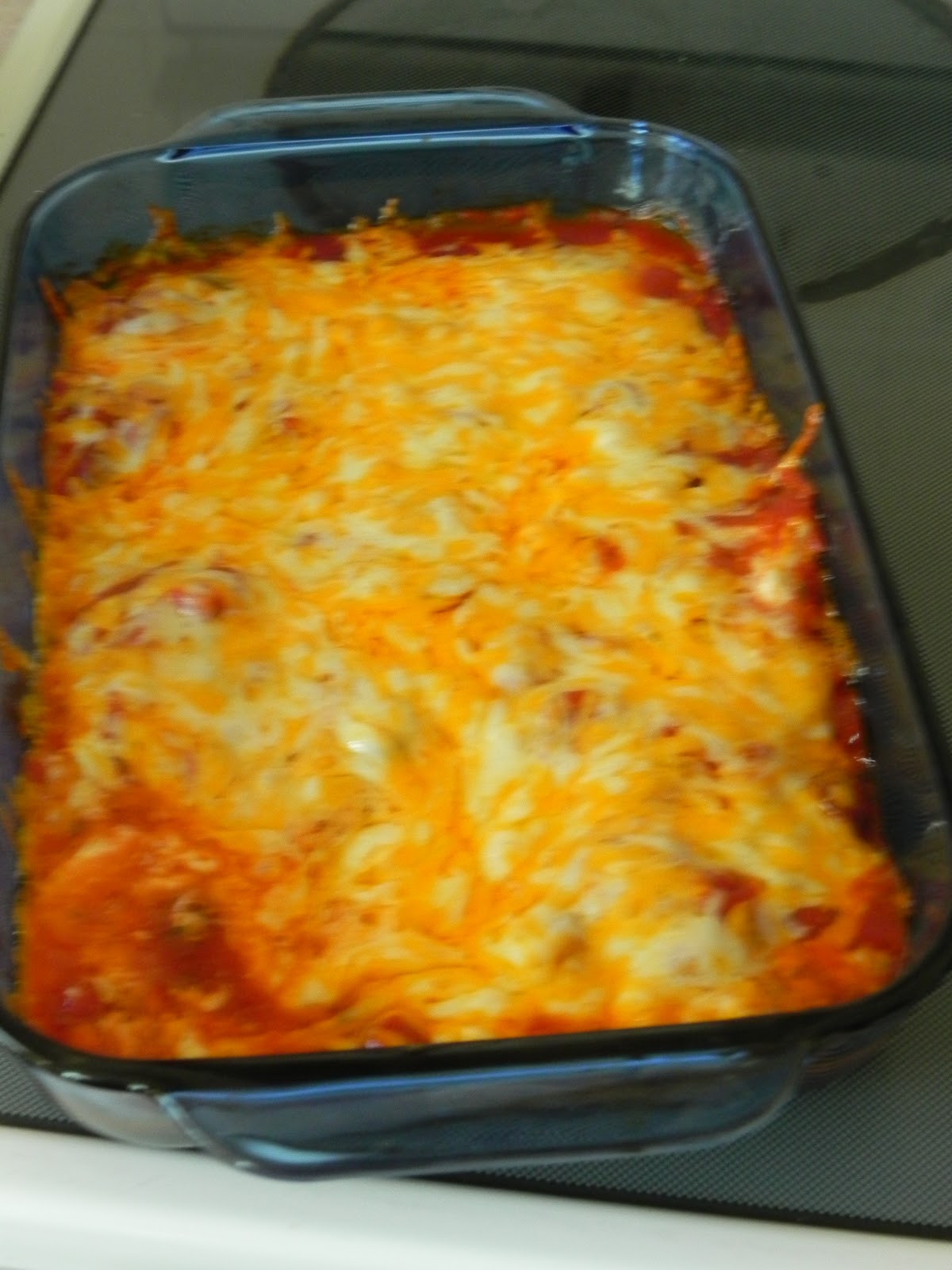 The Chicken was even easier to do, take chicken breasts or chicken pieces whichever cut you like the best and put in the bottom of a glass pyrex baking dish. Or any baking dish you are comfortable using. Add spaghetti or tomato sauce on top. I used a spaghetti sauce because I was in a hurry and I didn't want to have to flavour my tomato sauce. Then top with cheese. Bake at 350 for 45 minutes and Serve and Enjoy